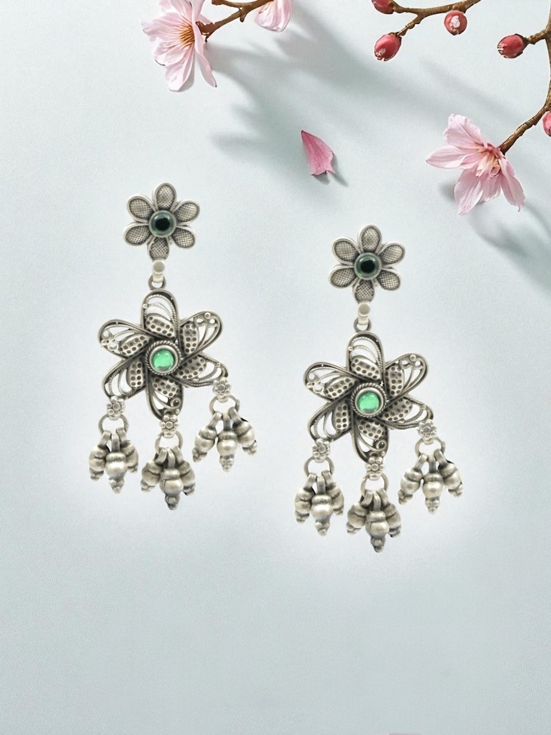 Azita 925 Sterling Silver Oxidised Flower Dangle and Drop Earrings for Women and Girls| Green Beads at center| with certificate of authenticity and 925 stamp.